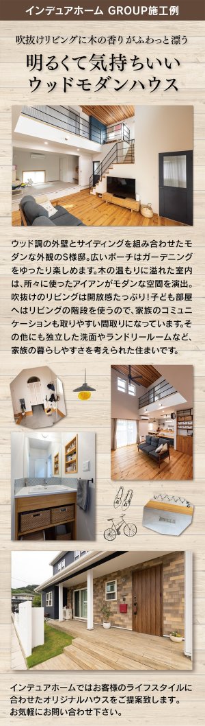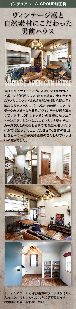 ヴィンテージスタイル、カリフォルニアスタイル、フレンチスタイル、プロヴァンススタイル、アメリカンスタイル、モダンスタイルの家のことなら、私たちインデュアホーム熊本東が、こだわりの住宅を自信をもって心を込めておつくりします。自然素材の塗壁や、無垢のフロアーなどをふんだんに使用して、高性能でエコな住まいづくりを心がけています。新築(注文住宅)・リノベーションのお問い合わせは、お気軽にインデュアホーム熊本東までご相談下さい。